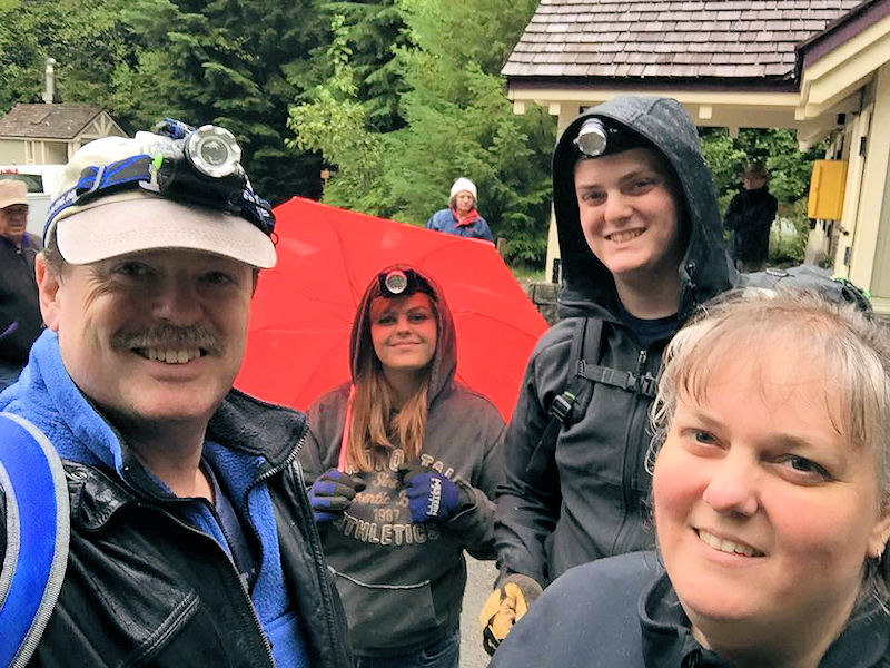 Finally, I reached the metal stairs near, but not quite at, the cave entrance. Coming the other direction, from the upper branch of the cave, I saw a T-shirt I recognized. It was Matthew Benedict and his family group. What a relief! I fumbled with my jacket hood while talking with them, and there was my glasses bow, still stuck in my messy hair and hat.