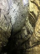 Bruce was having trouble with depth perception, so he turned around before the end of the lower tunnel, but I went on. At times, I was annoyed by having to sidestep all the noisy kids. But I envied the kids their sense of wonder and their enjoyment of walking through the short yard-high part of the cave. Shortly after I turned around, I could still hear voices, but I could no longer see anyone else's lights. I turned off my own light and tried to imagine what it would be like to be stranded there. Scary!
