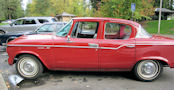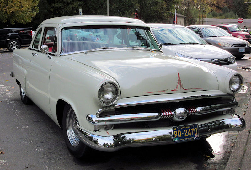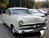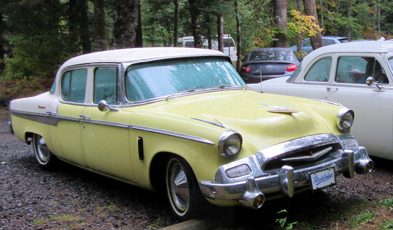 With rain in the forecast, many tour participants decided to drive "modern iron" or "Brand Xs" instead of their old cars. So, although we had about twenty people show up, there were only four old cars: Bruce and Sue Kerslake's red 1960 Lark, Katherine and Duane Benedict's dark blue 1979 Chrysler New Yorker, Jeff Penuel's tastefully pinstriped 1953 Ford, and Ed and Jo Anne Sallia's yellow 1955 Studebaker President.