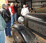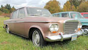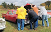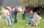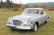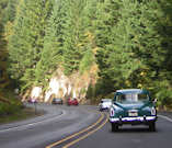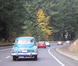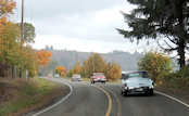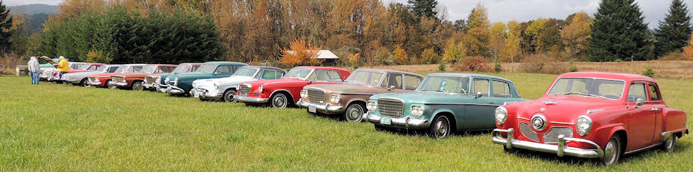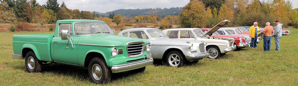Some other traditions of this tour are wearing Halloween costumes, taking a picture of the Gaffneys' red bullet-nose next to a red sumac bush, and getting pumpkin lattés at our meeting place, the Hillsboro Fred Meyer store. I wore my bumblebee outfit, as Keith Reno called it. And in this year's photo, Phil's bullet-nose was joined by Dana Scott's Lark, Dana himself, and his daughter Frances, with a big beautiful smile. Also with us were a couple of new members, Mick & Ruth DeSantis, whom Bruce knew through the Plymouth Club. They have recently bought a 1958 Hawk, and they also brought some delicious brownies to share. As scheduled, we departed at about noon, heading west on Hwy. 26. After getting out into the hills, we turned left onto Timber Rd. A few miles farther, we crossed a bridge and entered the old hamlet of Timber. Visiting this village is like taking a trip back in time. All the ancient wooden buildings seem to be clinging to the hillside, with nary a flat spot in sight, except for the railroad tracks. And there were lots of majestic yellow bigleaf maples, just to make sure we got enough fall colors. Down, down we drove, into a curvy canyon, and finally out to Hwy. 6, then Hwy. 8, then to the village of Gales Creek, and the Gaffneys' house. Phil & Alexis' daughter Sarah greeted us with cups of hot cider. She had very kindly come out to help, including sautéeing some colorful bell peppers and onions, which tasted wonderful on the hot dogs. Two drivers had had some mechanical problems. John Bernhardt's Hawk's wipers wouldn't shut off. One of the ears and the bracket on Murl Jones' Commander's alternator broke. Phil Gaffney gave Murl a clamp to hold his alternator together, and he made it home all right. The Gaffneys' beagle Peabody was in fine form, barking at Sheila Muck's tiny dog Molly. While Alexis held Peabody back, poor little Molly got stung on the face by a yellow jacket. Yes, the yellow jackets were also in fine form, and at least one human got stung, as well. A little later, Phil gave a tour of his garage and barns. He has sold about half of his car collection, a better job than most of us have done. He still has two 1920s-era Studeys, his "root beer float" (a brown and white Hawk), an M-series truck, a working vintage tractor, and of course, the red 1951 Commander that he drove on the tour. The Gaffneys' acreage is perfect for a Studebaker lineup. No ugly parking lot stripes, stores or modern cars. Just a beautiful backdrop of grassy fields, trees and sky. And plenty of gopher holes to trip up those with wobbly ankles. As things were winding down, a drizzle started. That sent people scurrying to finish packing up! -- Sue Kerslake |